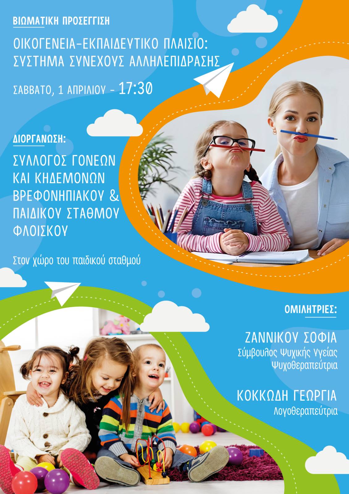 Το Σάββατο 1 Απριλίου 2023 και ώρα 17.30 επισκεφθήκαμε τον βρεφονηπιακό και παιδικό σταθμό Φλοίσκου για να προσεγγίσουμε βιωματικά το θέμα «Οικογένεια-εκπαιδευτικό πλαίσιο : Σύστημα συνεχούς αλληλεπίδρασης».